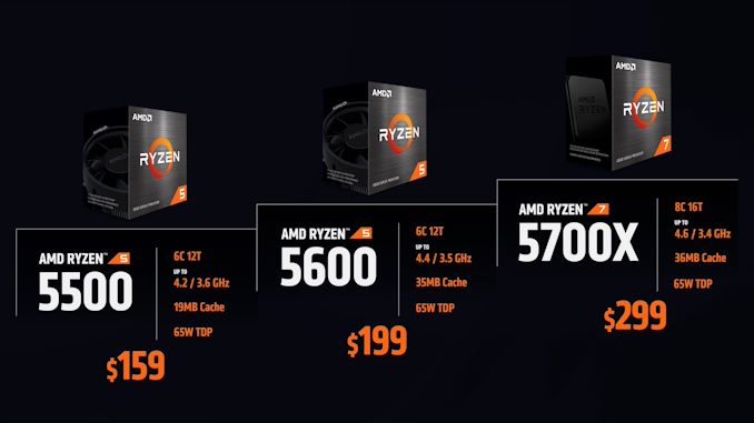 We’ll start with the new Ryzen 5000 series chips, the Ryzen 7 5700X, Ryzen 5 5600, and Ryzen 5 5500. Like the rest of the 5000 series, these are all based on the Zen 3 architecture, and based on the specifications look to be using a single Zen 3 CPU core chiplet. With 6 cores each, the $199 5600 and $159 5500 are designed to bring the 5000 series family down to the ~$150 price point.