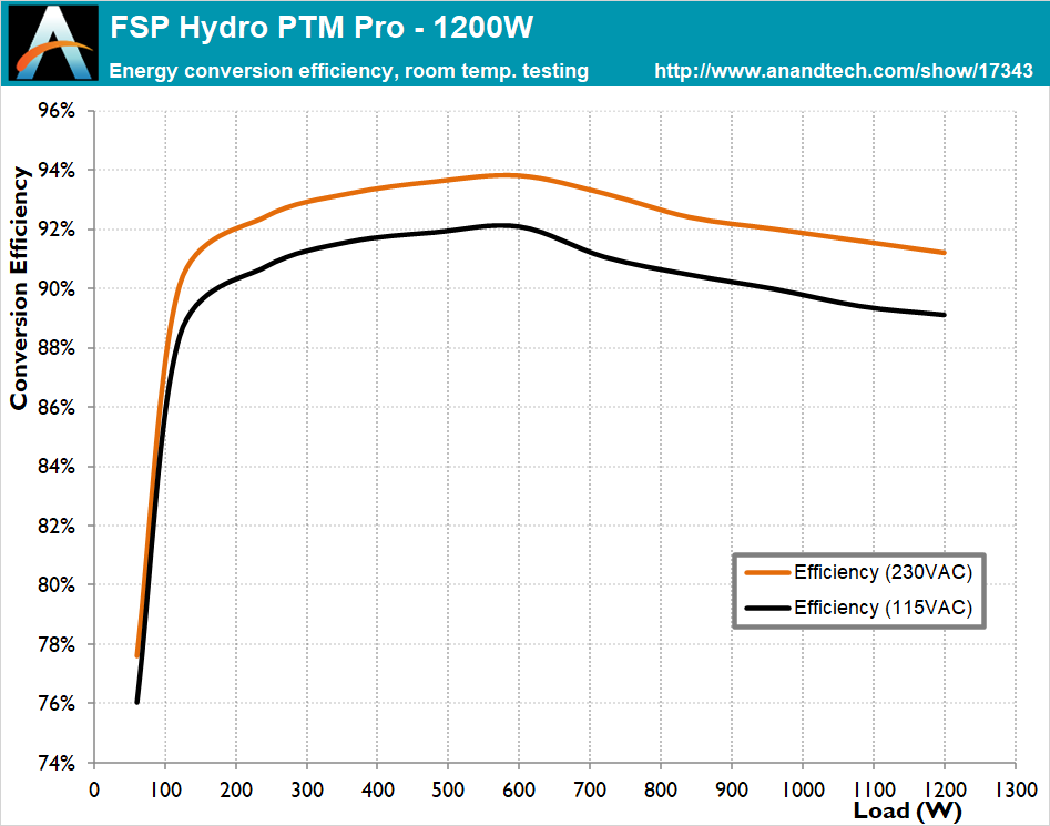 The efficiency of the Hydro PTM Pro meets the 80Plus Platinum certification requirements when it is powered from an 115 VAC source. When powered by a 230 VAC input, the efficiency is increased by an average of 1.9%, yet that is not enough to reach the 80Plus Platinum efficiency requirements for 230 VAC devices. The average nominal load efficiency (20% to 100% of the unit’s capacity) is 92.6% with the unit powered from a 230 VAC source, and drops down to 90.7% if the unit is powered by a 115 VAC source. What is interesting is the very low load efficiency, which seems to be rather poor.