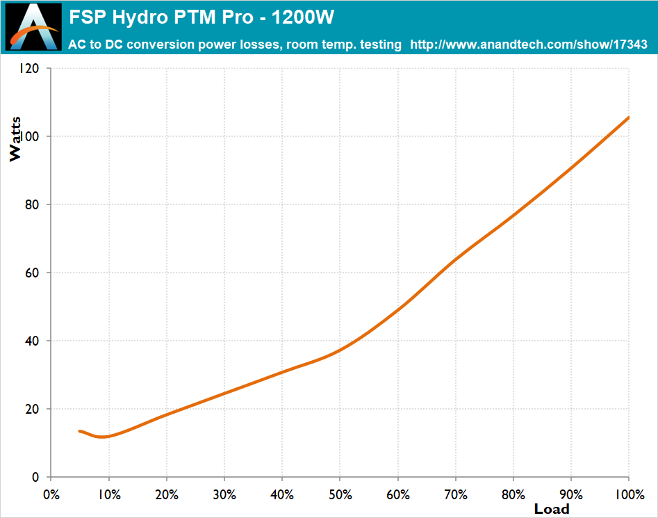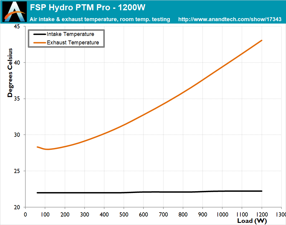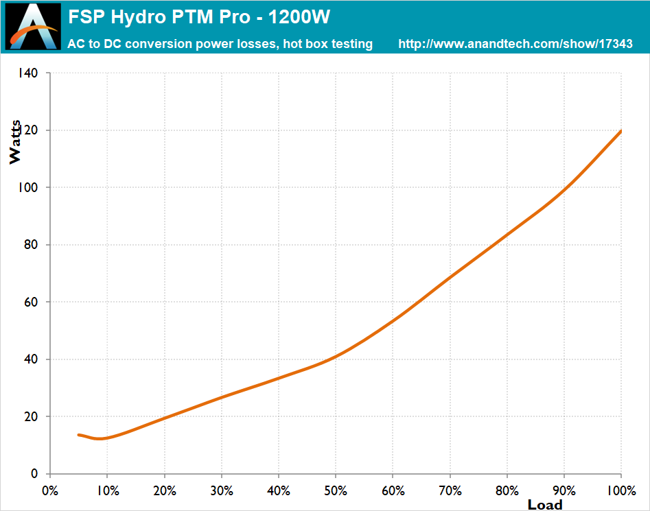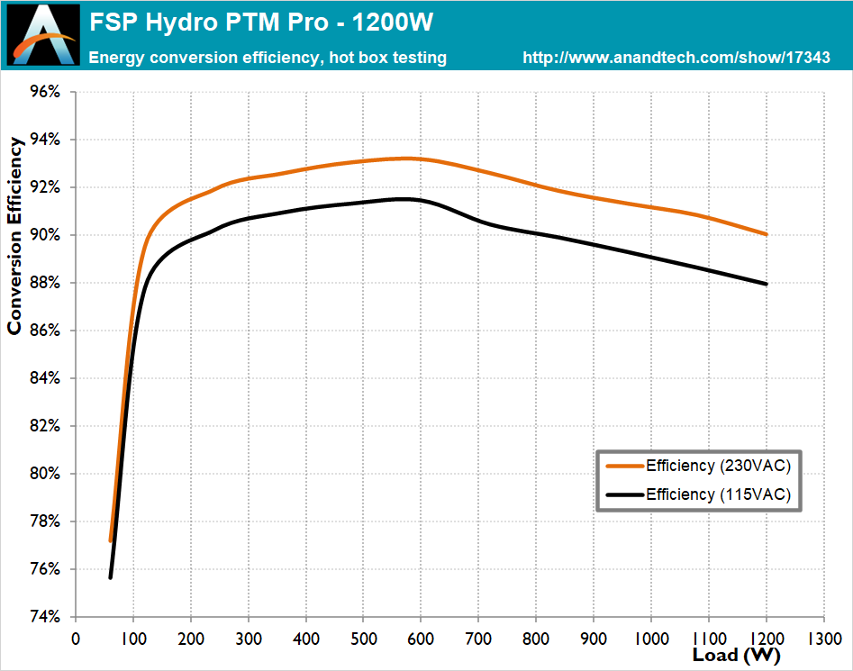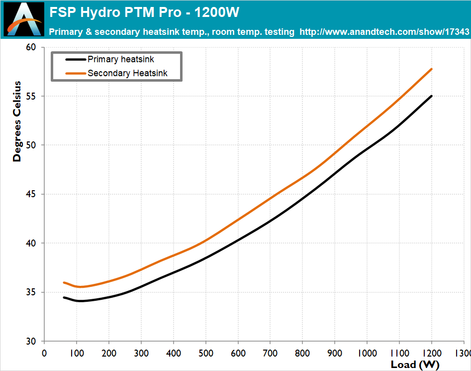 The FSP Hydro PTM Pro 1200W PSU is made of quality components and is capable of withstanding high internal temperatures without measurable performance degradation. There is a more significant efficiency degradation when the load is above 1000 Watts though, suggesting some thermal stress, which could possibly be avoided should the designer would have used larger heatsinks. Still, the overall efficiency drop is reasonable, at 0.7% across the nominal load range.