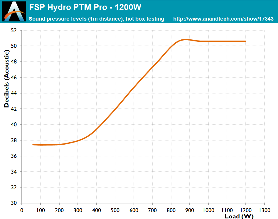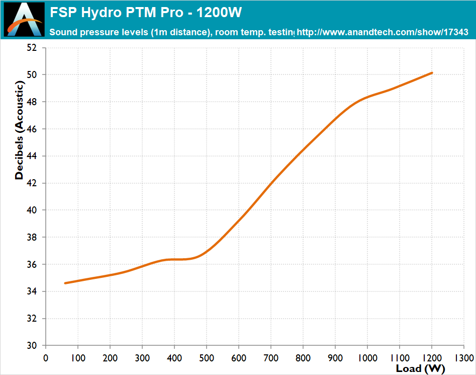 Due to the small heatsinks, most of the cooling work falls on the Protechnic Electric fan. Regardless of the high ambient temperatures, the fan does maintain relatively low noise levels while the load is below 500 Watts, but it almost instantly jumps to its maximum speed after that point and maintains that top speed up to the unit’s maximum capacity. The FSP Hydro PTM Pro is very loud with its fan running at maximum speed but stays operational without performance or reliability issues.