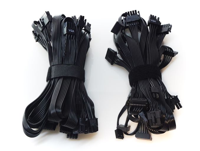 The FSP Hydro PTM Pro 1200W PSU is a fully modular design, allowing for the removal of every DC power cable, including the 24-pin ATX connector. All of the cables are black, ribbon-like, with black connectors. An odd observation is that there are three EPS connectors – or at least a cable with two connectors and another cable with one connector on it. The two cable bundles are held by reusable cable straps.