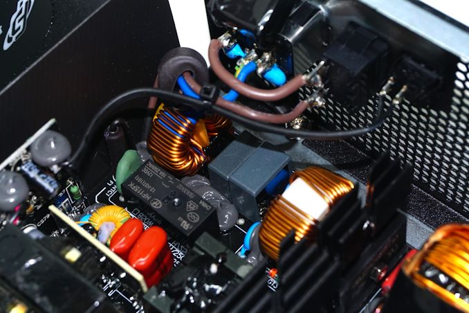The layout is very clean and the circuitry components are grouped nicely together. A significant amount of hot glue is keeping all connectors and parts that might be somehow freed fastened in place. The filtering stage is pretty basic and begins on the rear of the AC switch, with four Y capacitors, three X capacitors, and two filtering inductors. The filtering stage leads to two large rectifying bridges, which are placed on their own heatsink.