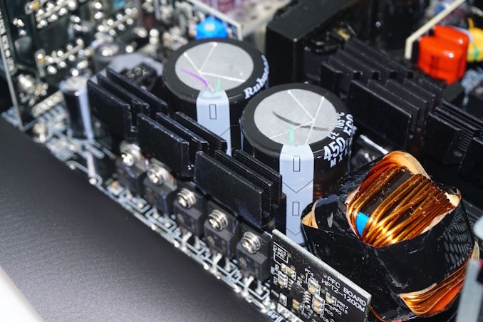 The passive components of the APFC circuitry are two large 450V/560μF APFC capacitors made by Rubycon, followed by a large filtering coil. The active APFC components are on a long heatsink across the edge of the PCB. Four transistors form a full-bridge inversion topology at the primary side of the unit. The outputs of both transformers are connected to eight power MOSFETs that generate a single 12V rail.