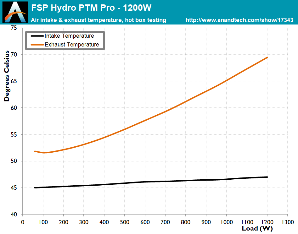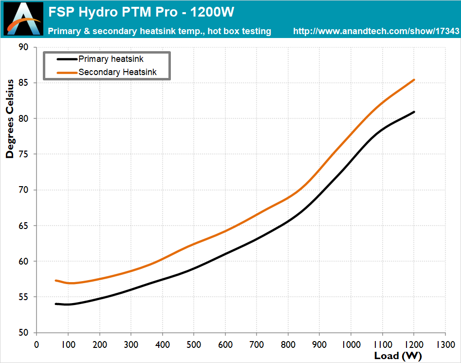 Regardless of the 80Plus Platinum efficiency, the high power output of the FSP Hydro PTM Pro creates very significant thermal losses for its cooling system to deal with. The internal temperatures are slightly high while the unit was operating inside our hotbox, but do stay within reasonable operating parameters. As a matter of fact, the cooling profile is very aggressive and is trying to maintain very low component temperatures.