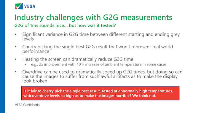 The resulting methodology is essentially G2G testing with all of the shenanigans stripped out to avoid cherry-picking results. Among other things, VESA’s test requires an ambient (room) temperature of 22.5 to 24.5 Celsius (72.5F-76F) and that a panel has reached its equilibrium temperature. This is because the response times of liquid crystals varies with the temperature, and thus a display can produce unnaturally good times if the panel is heated. The size of the heating effect is actually rather surprising: according to VESA, they’ve seen some displays halve in response times just by increasing the ambient temperature by 5.5C.