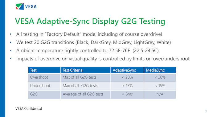 In short, VESA believes that testing response times at multiple refresh rates is unnecessary, because in Adaptive-Sync mode displays should always be updating pixels at their maximum rate so that they’re ready for the next frame ASAP. This is a very interesting point, and one that will warrant a further look once there are monitors available that have passed the AdaptiveSync display conformance test. In the meantime it should be noted that this also doesn’t preclude displays using variable overdrive, as a display could implement it and still pass the conformance test.
