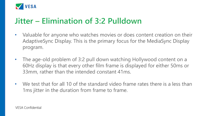 The big impetus behind MediaSync, beyond getting rid of display flicker, is putting a stake in jitter due to the mismatch between typical media framerates and PC display refresh rates. With most professional media content authored to 23.976, 3:2 pulldown jitter has been an issue for PCs for as long as they’ve had media playback capabilities. And since resolving it requires a relatively small range of refresh rates, variable refresh rate tech has always been well-primed to solve the matter.