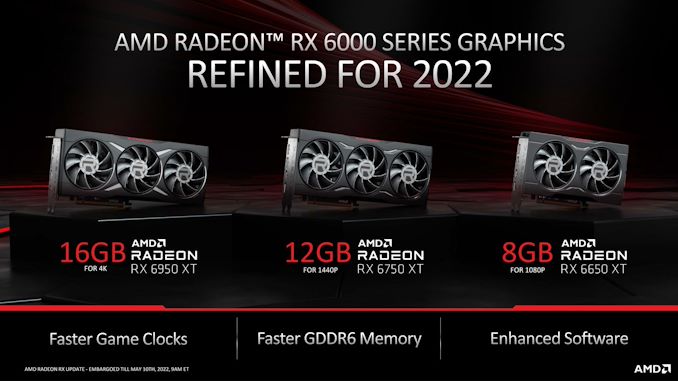 AMD this morning is taking the wraps off a trio of new Radeon RX 6000 series video cards to round out its product stack. Aimed at everything from the midrange to flagship markets, the new Radeon RX 6950 XT, RX 6750 XT, and RX 6650 XT are being released as a mid-generation kicker to the Radeon family, to give AMD’s most important cards one last boost in performance. Taking advantage of newer 18Gbps GDDR6 memory along with slightly improved clockspeeds, the new cards, being released today, promise modest performance gains while giving AMD a chance to show off what their RDNA2 GPU architecture can do after nearly 18 months of refinement.