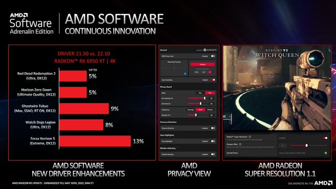 AMD’s GPU-accelerated Privacy View feature, which was originally slated to launch in Q1, is finally nearing release and should be in this month’s driver drop. Meanwhile, according to AMD an updated version of their driver-based AMD Super Resolution technology is in the works. Though at this point they’re not disclosing what features will be tweaked or added for what will be Super Resolution 1.1.