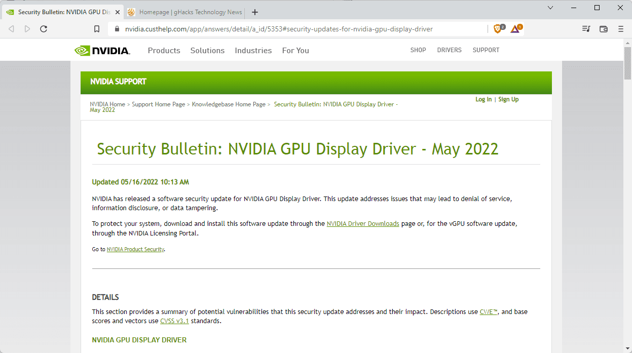 Nvidia released driver updates for most supported products as well. Nvidia Studio and Tesla R510 updates are expected in the week of May 23, 2022. All other supported products have received security updates already.