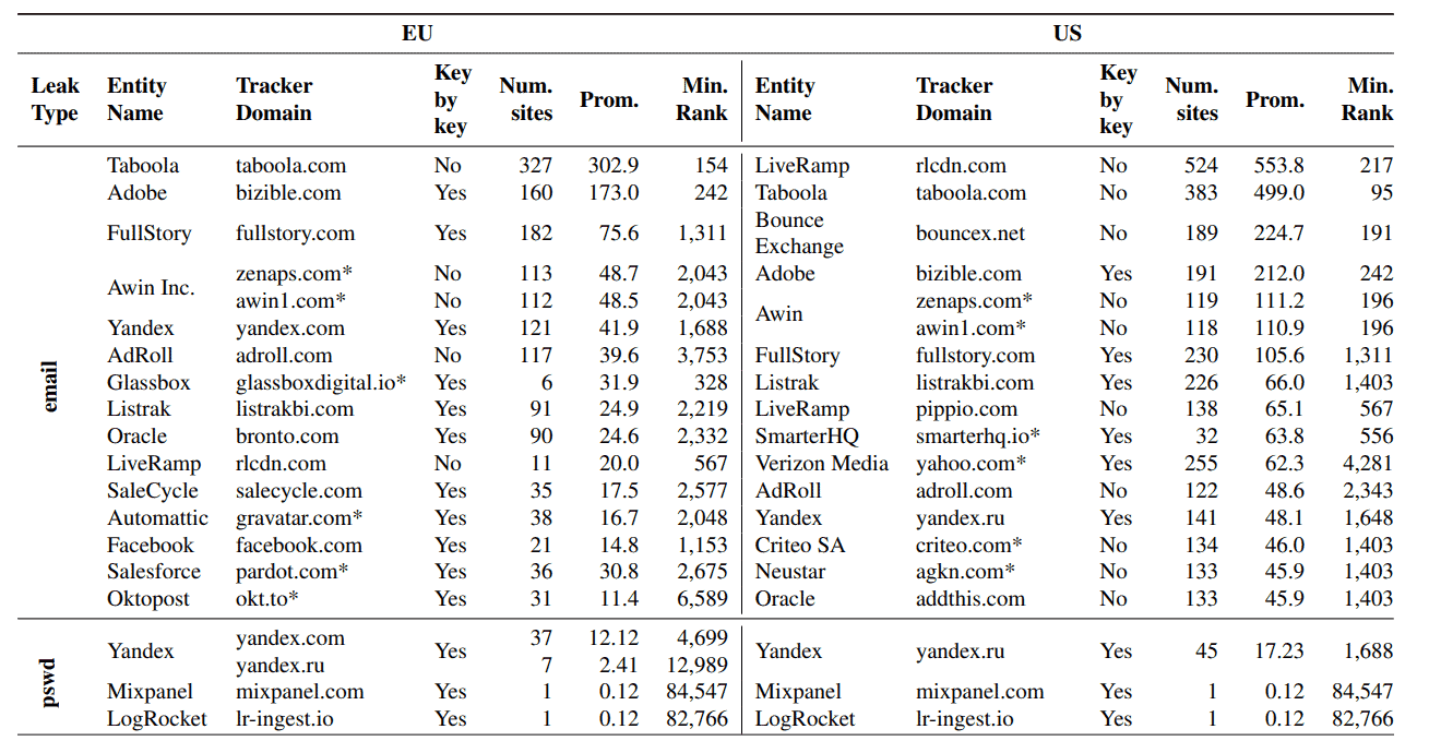 The five organizations that operate the largest number of trackers on sites that leak form data were Taboola, Adobe, FullStory, Awin Inc. and Yandex in the European Union, and LiveRamp, Taboola, Bounce Exchange, Adobe and Awin in the United States.
