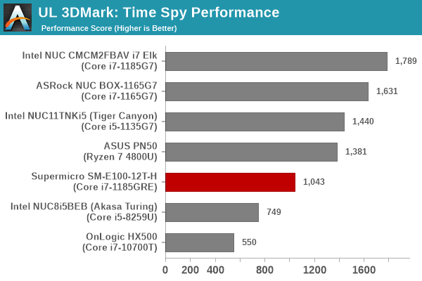 The key takeaway here is that the Iris Xe graphics in the SYS-E100-12T-H outclasses AMD’s Renoir in the ASUS PN50 despite having a TDP handicap. In the battle of iGPUs, the Tiger Lake systems outscore the Renoir / Cofee Lake systems handsomely, and within themselves, get ordered based on GPU clock speeds and available power budgets.