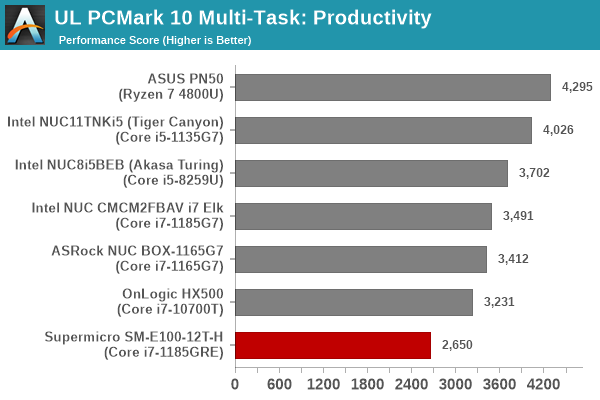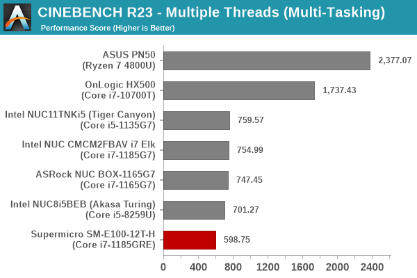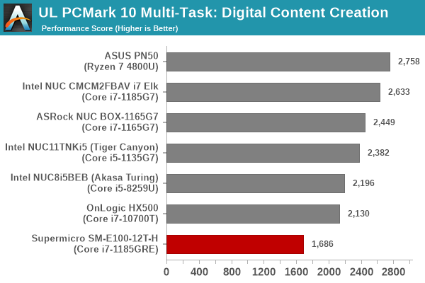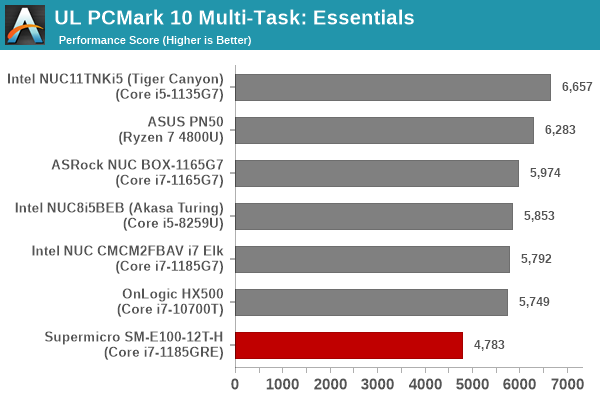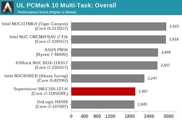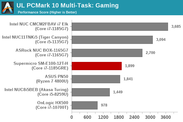 Despite appearing in the lower half of the graphs above, the Supermicro SYS-E100-12T-H puts up an impressive performance given its TDP constraints – 15W against the 20W – 35W configuration of the other systems’ processors. In almost all sections, we see the system edge ahead of the Coffee Lake-equipped Bean Canyon NUC and the OnLogic HX500 despite the TDP handicap – a testament to the improvements made in Tiger Lake by Intel.