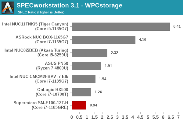 On the storage side, some applications require wide-temperature range and/or high endurance SSDs. The Supermicro SM-E100-12T-H uses a Innodisk M.2 (S80) 3TE7. It is a M.2 SATA SSD with a wide operating temperature change. However, it is no match for the performance provided by NVMe SSDs in other systems. From a benchmarking perspective, we provide results from the WPCstorage test of SPECworkstation 3.1. This benchmark replays access traces from various programs used in different verticals and compares the score against the one obtained with a 2017 SanDisk 512GB SATA SSD in the SPECworkstation 3.1 reference system.