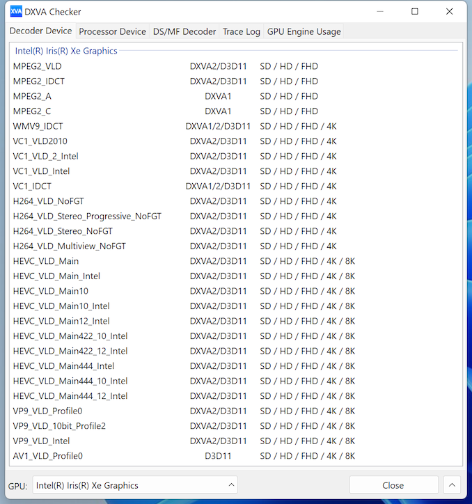 We opted to forego the evaluation of gaming and HTPC capabilities of the Supermicro SM-E100-12T-H – the system is simply not meant for those use-cases. In some circumstances (say, embedded PCs requiring processing of video feeds delivered over the network), the integrated GPU provides excellent decoding capabilities, as evidenced in the DXVAChecker screenshot below. All major codecs ranging from MPEG2 to AV1 are supported for decoding.