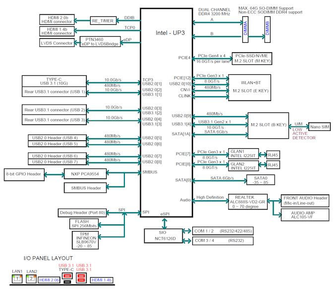 The key takeaway from the block diagram is the extensive support for embedded applications, while also sporting an aggressive outlook in terms of bandwidth allocation. Two separate x1 lanes are allocated to each Intel I225-IT controller for the dual 2.5 GbE LAN ports. There are plenty of serial and digital I/O ports connected to the SMBUS and eSPI pins o the SoC. Hardware TPM is available on board, and a SIM slot is also integrated – particularly useful for cases where the system gets deployed with 4G / 5G connectivity. The USB ports in the front panel are all Gen 2 (10Gbps), and there are plenty of USB 2.0 ports for hooking up legacy equipment.