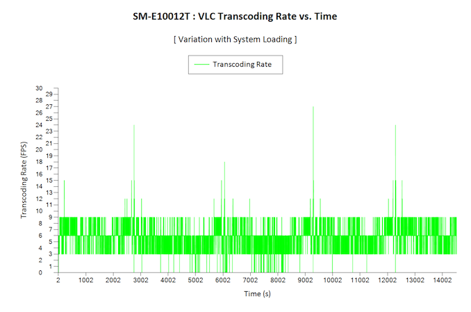 After the completion of all the workloads, we let the transcoding routine run to completion. The monitored transcoding rate throughout the above evaluation routine (in terms of frames per second) is graphed below.