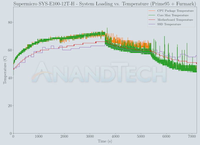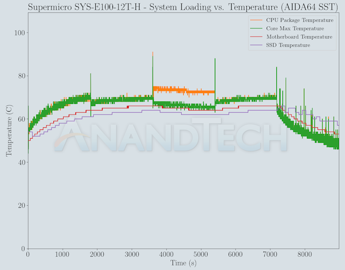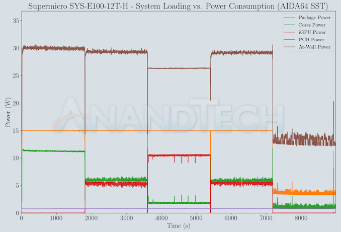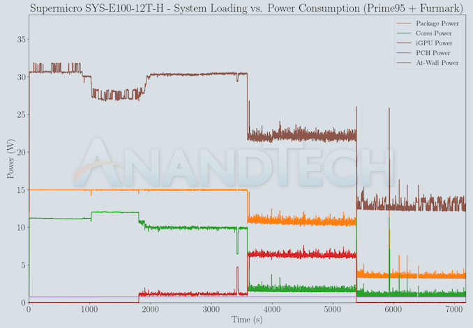 The numbers are consistent with the TDP and suggested PL1 / PL2 values for the processors in the systems, and do not come as any surprise. With the PL1 and PL2 set conservatively to just 15W by Supermicro, the peak power consumption is less than 32W and is sustained in nature. The idling power is a bit high, but can be explained by the presence of various high-speed I/Os and their supporting chips on the board.