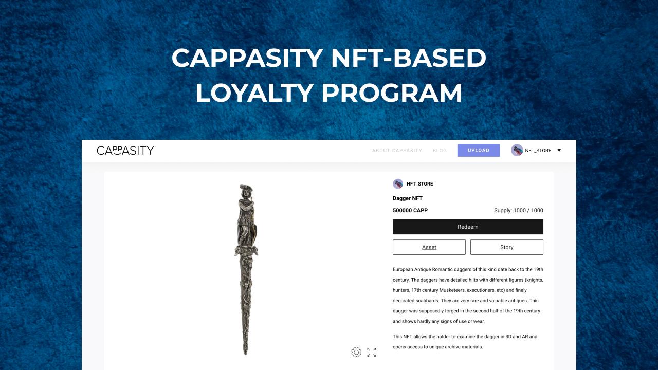 Stores will be able to give NFTs to their customers as a gift or sell them directly on the platform. Cappasity’s enterprise clients will also be able to use tools, allowing them to provide customers with a unique NFT along with the sold physical item. Using NFTs for creating a loyalty program is a perfect way to engage consumers through unique and exciting digital experiences and gain a competitive edge in the market.