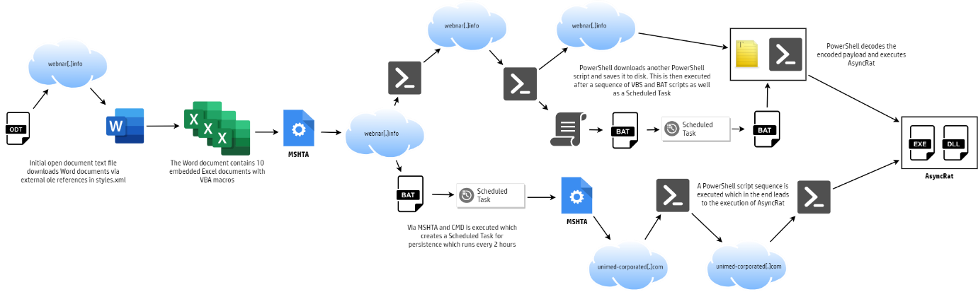 The macro that is part of the Excel documents uses the mshta.exe tool of Windows to download and execute code from the Internet. Things start to accelerate from there as a “complex chain of PowerShell, VBScript and batch scripts” was executed. In the end, the open source remote access trojan AsyncRAT was decoded and executed.