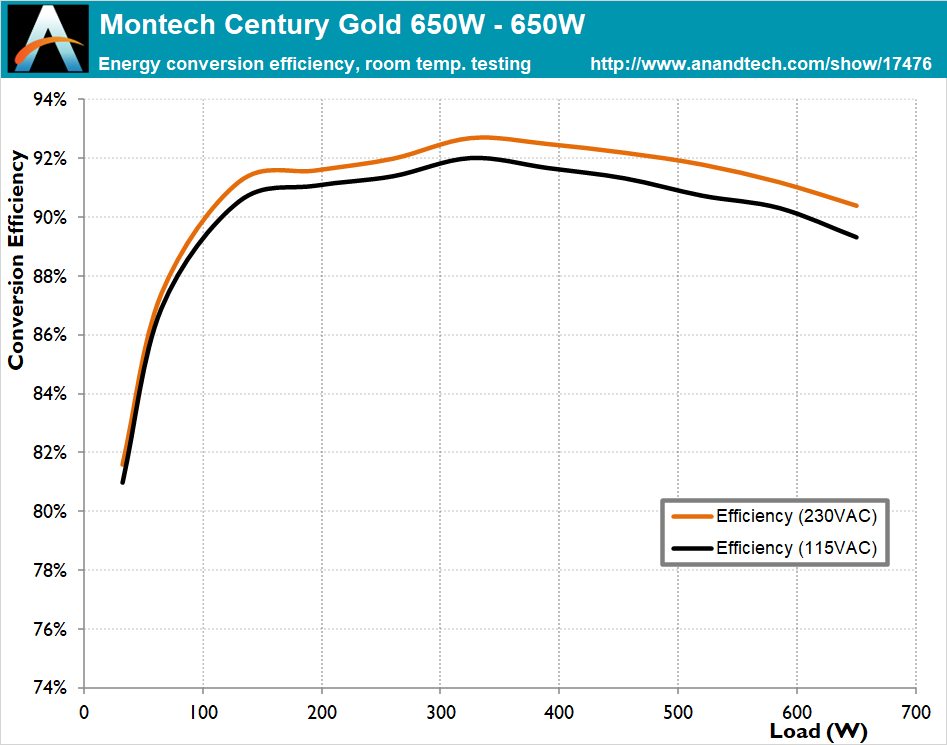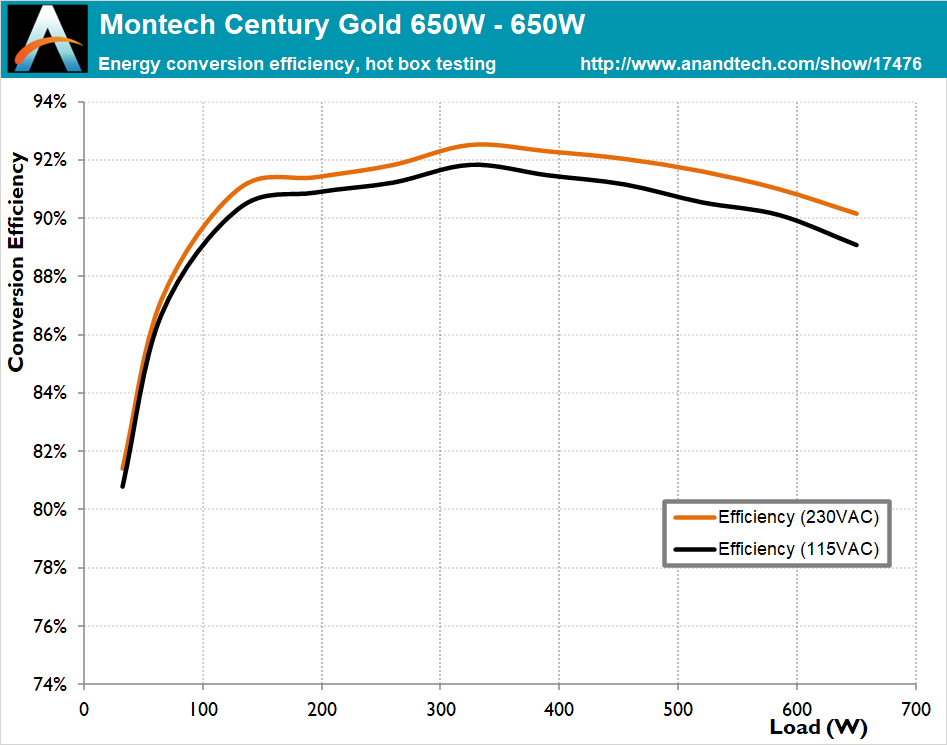 The 80Plus certification requirements are stricter when the device is powered from a 230 VAC source, so most manufacturers only work towards meeting the requirements with a 115 VAC input. This is not the case here, as the Montech Century Gold 650W unit is exceptionally efficient regardless of the input voltage, easily meeting the 80Plus Gold requirements in either case. The average nominal load range (20% to 100% of the unit’s capacity) efficiency of the Montech Century Gold 650W unit is 91.7% when powered from a 230 VAC source, or 90.9% when powered from a 115 VAC source.
