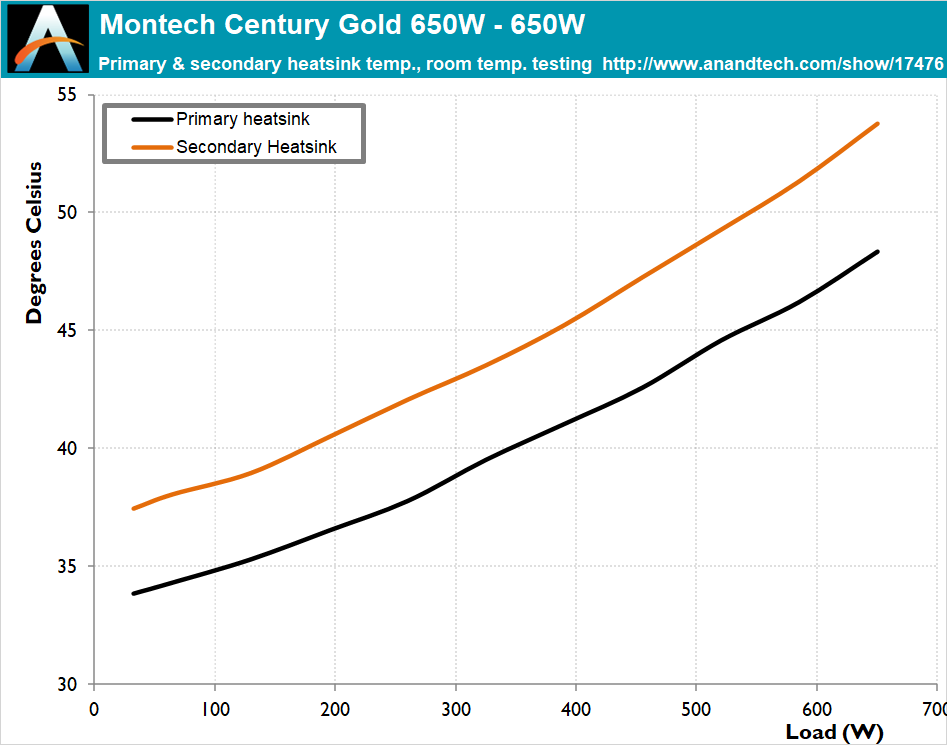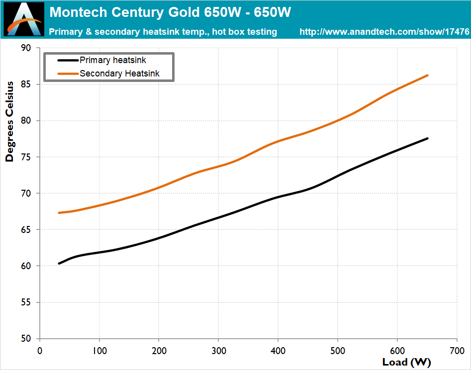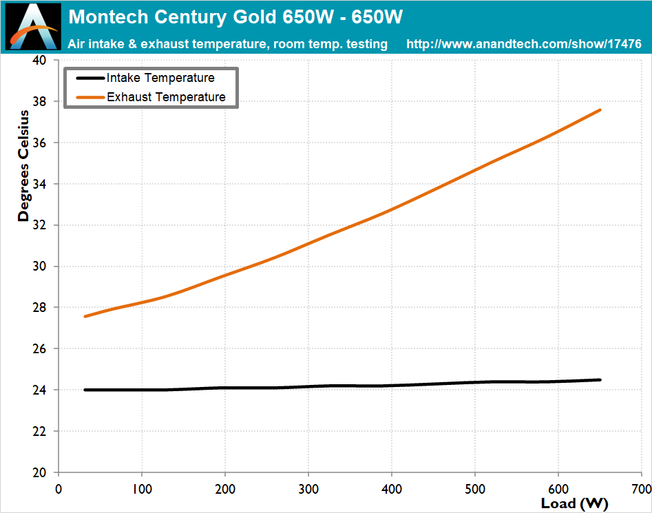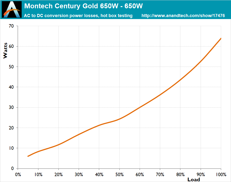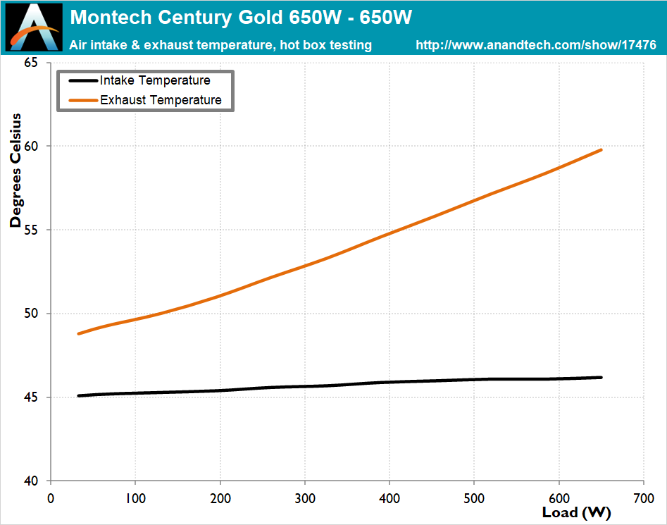 For a product of this class and price range, the Montech Century Gold 650W PSU is extremely resilient to high environmental temperatures. The performance of the PSU was largely unaffected while it was operating inside our hotbox, with the average efficiency drop being just 0.2%. The degradation at maximum load was slightly more substantial but still remained negligible. This suggests that the components of the Century Gold are barely getting thermally stressed, even with the PSU operating at maximum capacity in our hotbox.
