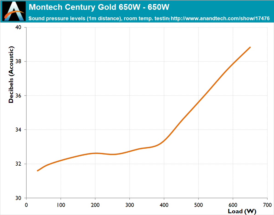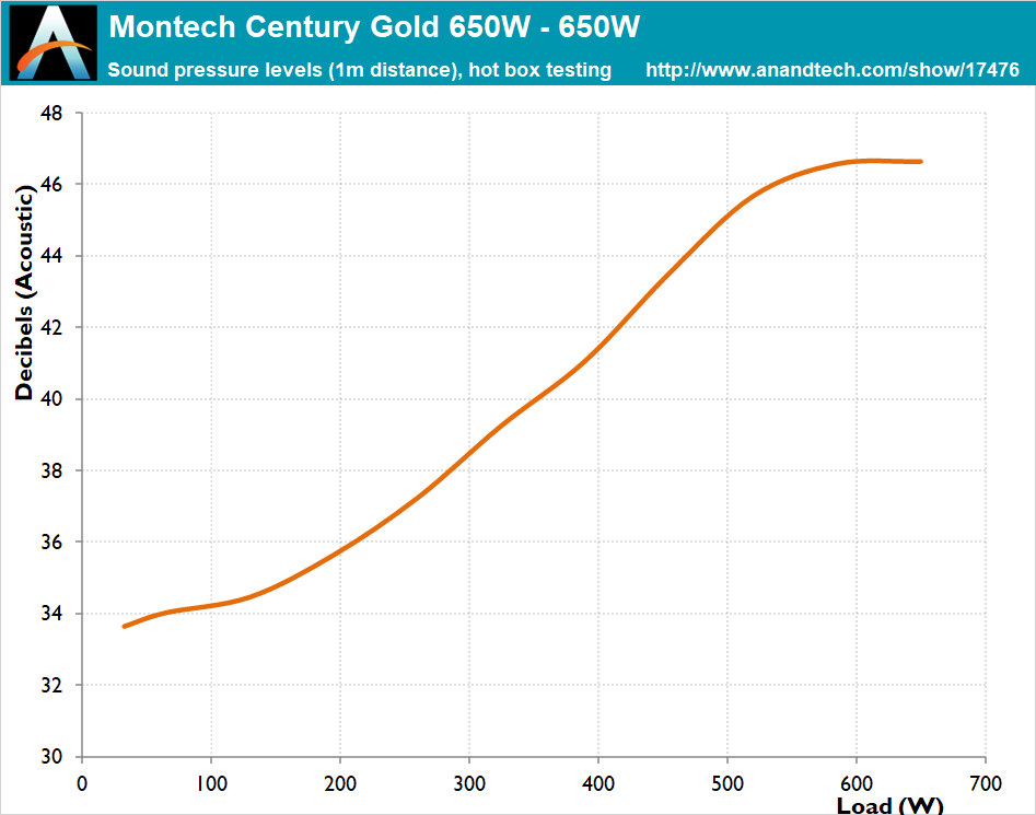 Despite the simple thermal control, the Century Gold has its fan spinning at low speeds even while the ambient temperature is high and increases the speed of the fan (and, in extend, the noise) alongside with the output power of the unit. If the Montech Century Gold 650W PSU is found operating under a very high ambient temperature, the Yate Loon fan will be almost silent while the system is idling, clearly audible at half load, and loud while the unit is operating at maximum capacity.