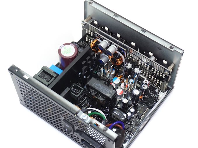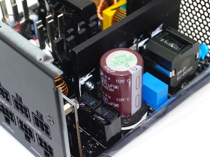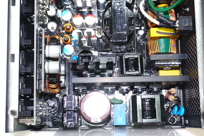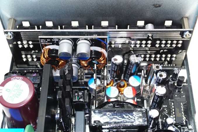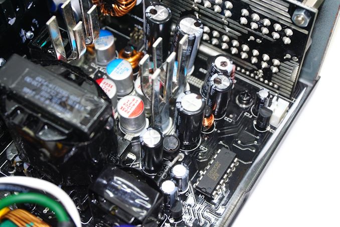 Two transistors form a typical half-bridge inversion topology at the primary side of the unit, while six MOSFETs generate the 12V line at the secondary side of the transformer. The 3.3V and 5V lines are generated via the DC-to-DC conversion circuits. This is a very typical configuration for an 80Plus Gold-certified unit. The heatsinks of the active switchers on either side of the transformer are of higher complexity than those used for the APFC circuitry and the primary bridge. All of the secondary capacitors, electrolytic and polymer alike, are provided by Nippon Chemi-Con and Nichicon, both of which are highly reputable Japanese manufacturers.