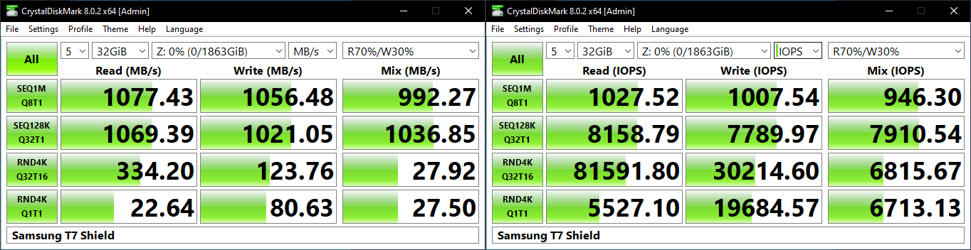 The performance in these workloads depends on the raw interface speed, and the capabilities of the internal SSD. The top drives are either those with a 20 Gbps interface, or ones with DRAM-equipped internal SSDs. Since the T7 Shield is a DRAM-less PSSD, it comes in the middle of the pack.