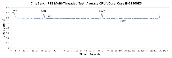 Using the integrated logging feature on the HWInfo monitoring software, we ran CineBench R23’s multi-threaded test on a 5-minute loop to show where the Core i9-12900KS isn’t quite so strong. Focusing first on the CPU V-Core of the Core i9-12900KS on our MSI Z690 Carbon WIFI, we saw an average V-Core of 1.409 V at the beginning of the test.