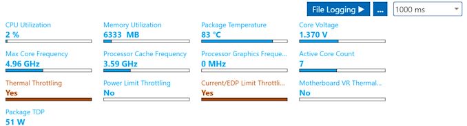 Screenshot of monitoring panel on Intel’s XTU after a benchmark run; thermal throttling is an issue