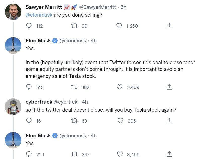 Musk also said that if the Twitter deal does not close, he will buy Tesla stock again.