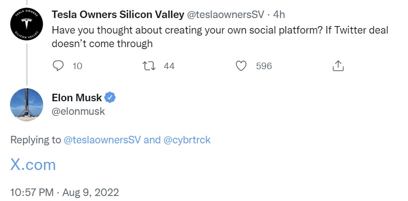Replying to a tweet asking him if he had considered creating his own social platform if the Twitter deal does not come through, Musk wrote: “X.com.”