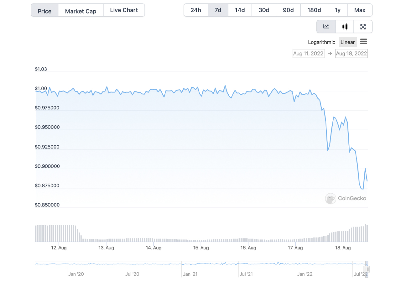 After the AUSD incident four days ago on August 14, another stablecoin pegged to the value of the U.S. dollar has dropped below USD parity. The stablecoin HUSD, associated with Huobi Global, has shed 16% in value on Thursday after dropping to a low of $0.827 per unit. HUSD’s depegging problem started on Wednesday evening (EST) when the stablecoin slipped to $0.92 per unit.