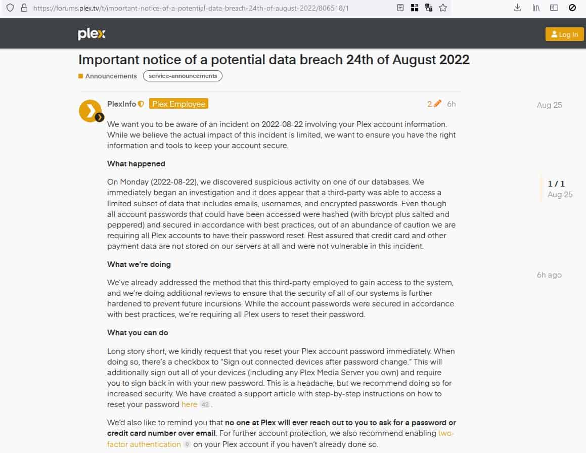 The streaming media platform, Plex, has revealed that it has been impacted by a data breach. The company has advised users to reset their passwords to protect their accounts.