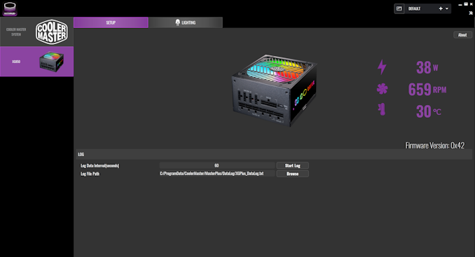 The communication of the Cooler Master XG Plus Platinum PSU with the system virtually is one-way. With the exception of its RGB lighting, nothing else can be configured in any way. Once the PSU has been selected, the primary screen is just displaying the same three readings that can be seen on the PSU itself. There is an option to start a log of these three values to a file, with adjustable logging intervals.