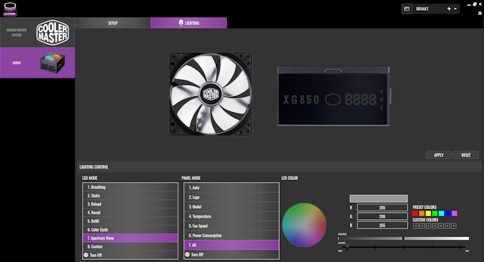 The second screen allows for lighting control, allowing the user to individually adjust the side screen and the fan lighting. There are not too many options here but these are plenty for a PSU. If more compatible Cooler Master devices are present, users can synchronize RGB lighting between all of them.