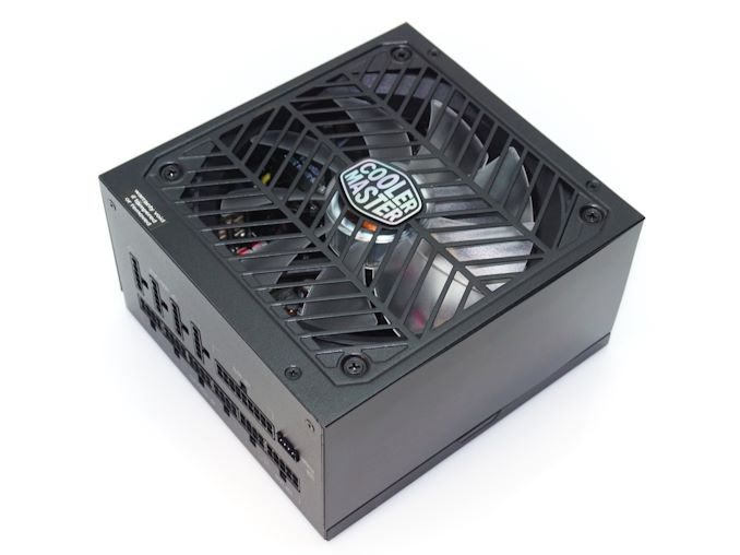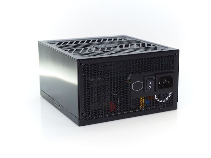 Cooler Master really does want their latest PSU to stand out from the crowd, thus they went with a custom chassis with an embossed left side and an integrated fan finger guard. The embossed left side will be visible if the unit is placed upside-down at the bottom of a typical ATX case. The sticker with the unit’s certifications and specifications covers most of the unit’s top side.
