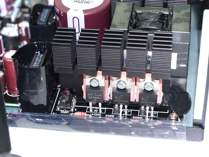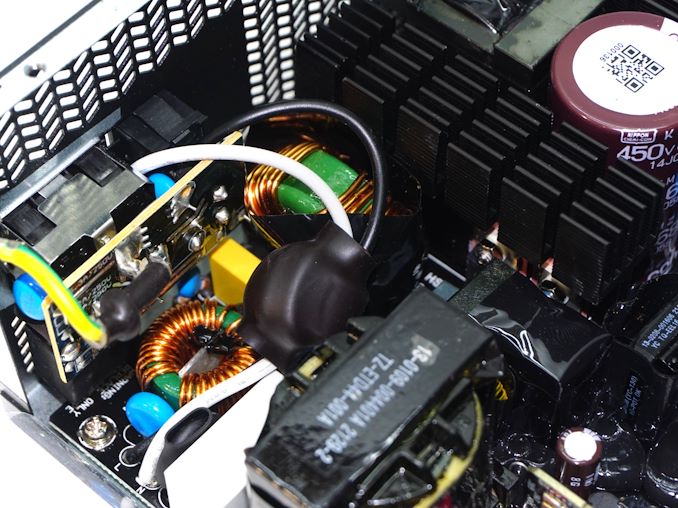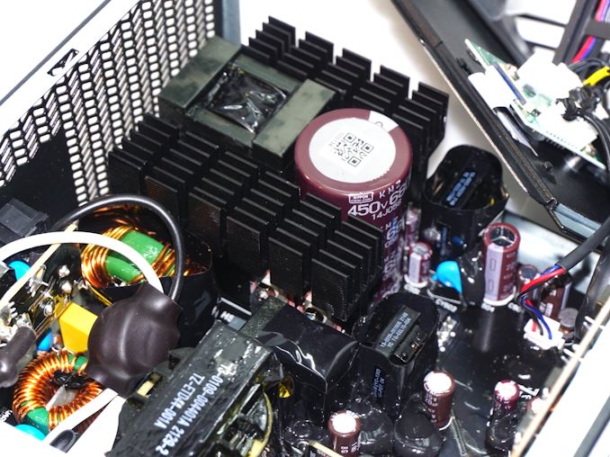 The 3.3V and 5V lines are being generated via the DC-to-DC conversion circuits. This would have been a typical configuration for any unit with a high efficiency certification, with the unique characteristic here being that the conversion circuitry is placed directly onto the board with the cable connectors instead of stand-alone PCBs. All of the secondary capacitors, electrolytic and polymer alike, are provided by Nippon Chemi-Con and Nichicon, both of which are highly reputable Japanese manufacturers.