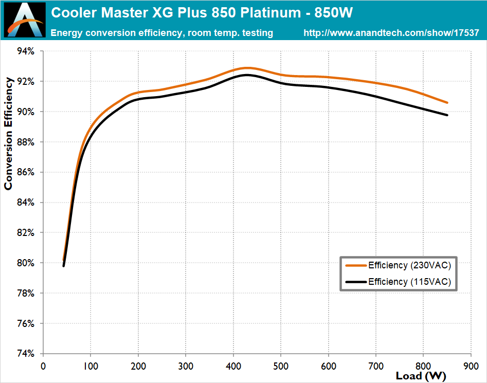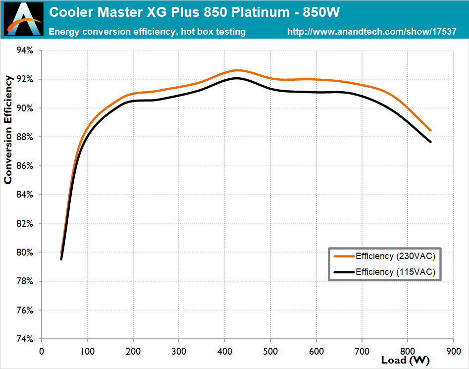 The Cooler Master XG Plus 850 Platinum PSU does meet the 80Plus Platinum certification requirements when powered from a 115 VAC source. The certification’s requirements are stricter when the input voltage is 230 VAC and this PSU fails to meet them, as it would have to surpass 94% efficiency at half load. The average nominal load range (20% to 100% of the unit’s capacity) efficiency of the Cooler Master XG Plus 850 Platinum is 91.8% when powered from a 230 VAC source, or 91.1% when powered from a 115 VAC source.