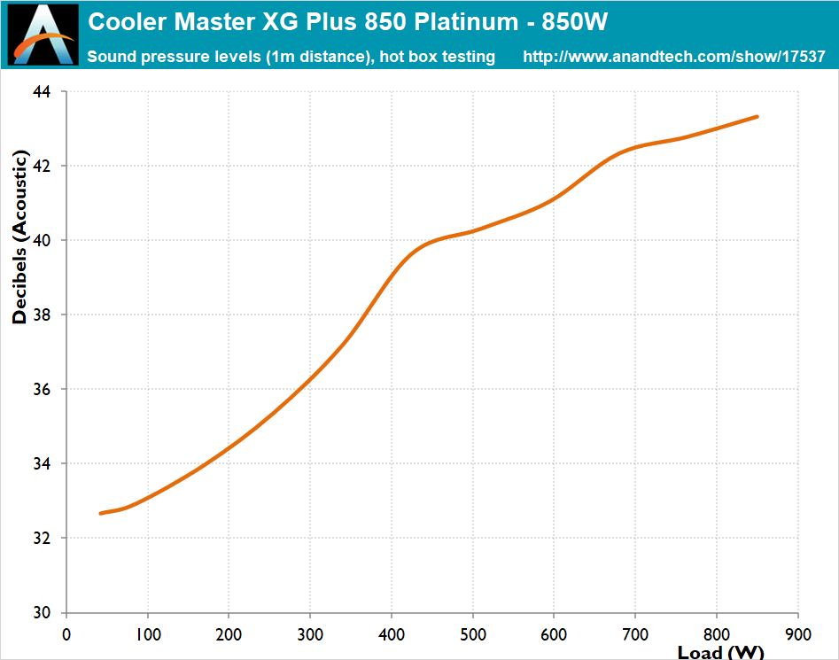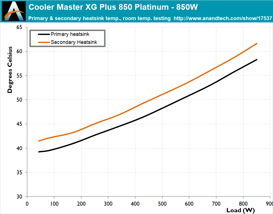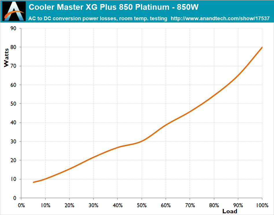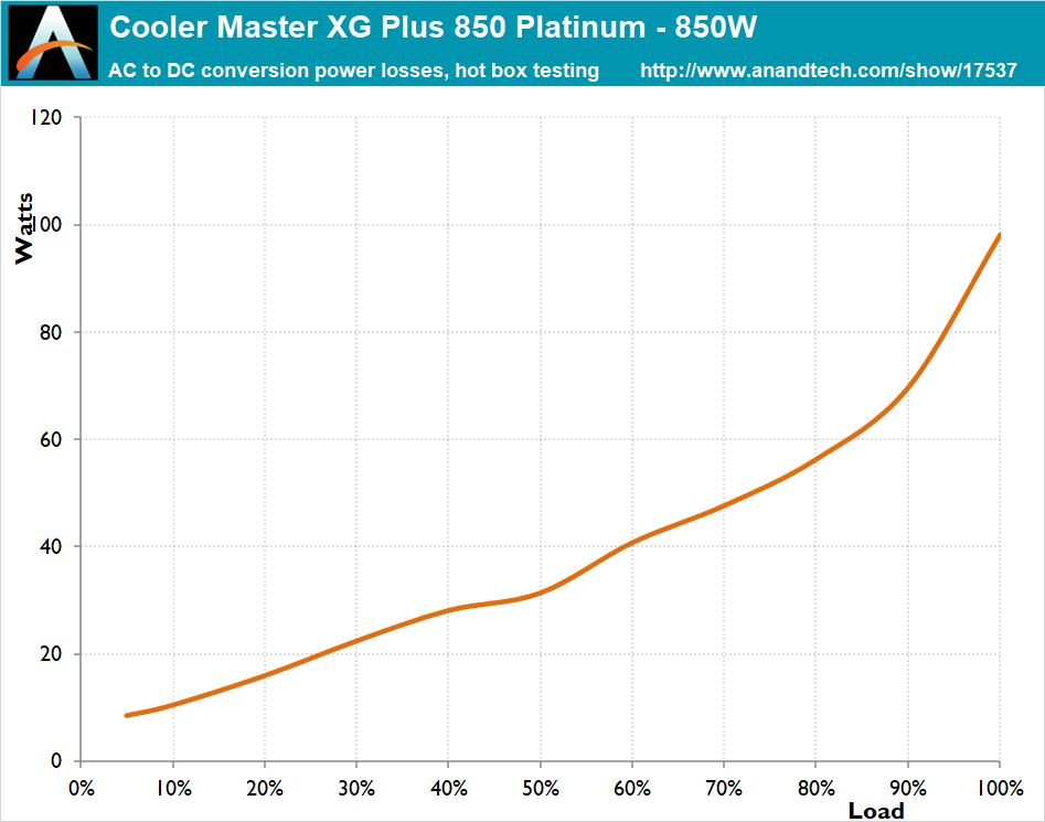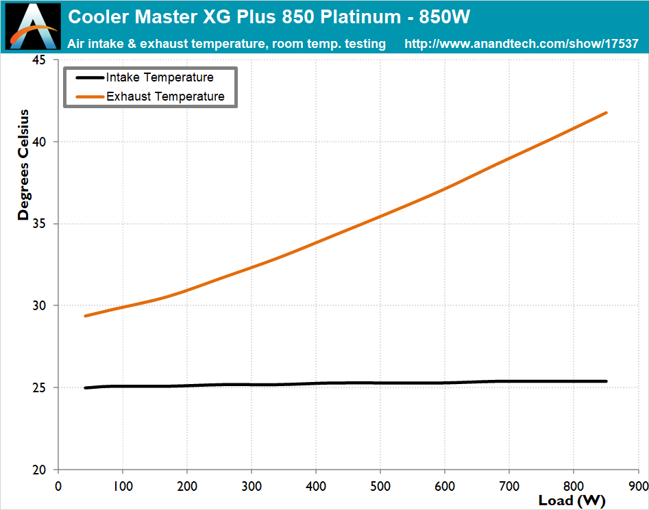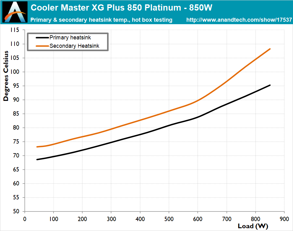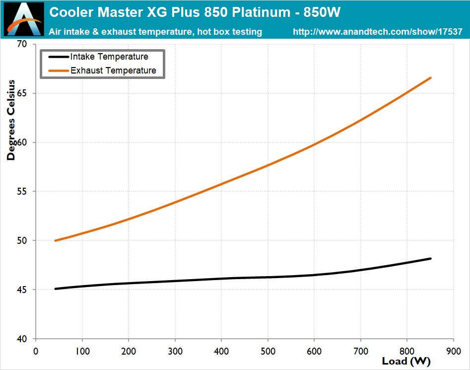 For the most part, the Cooler Master XG Plus 850 Platinum is resilient to high environmental temperatures, with the electrical performance of the unit largely unaffected while it was operating inside our hot box. The average efficiency drop across the entire load range is 0.6%, which is substantial, yet the drop up to an output of 700 Watts is less than 0.35%. While the PSU is heavily loaded, the degradation is severe, which usually suggests excessive thermal stress on the switching components.