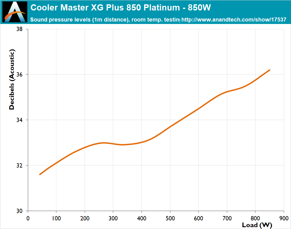 The electrical performance of the Cooler Master XG850 Plus Platinum PSU is good for a unit of this price range and class, but is not in any way special. The voltage regulation on all voltage lines is slightly under 1% across the nominal load range, which is fairly impressive considering most manufacturers neglect the secondary 3.3 V and 5 V lines. The power quality of all three voltage lines is very good, with a maximum ripple of 46 mV, 12 mV, and 10 mV on the 12 V, 5 V, and 3.3 V lines respectively.