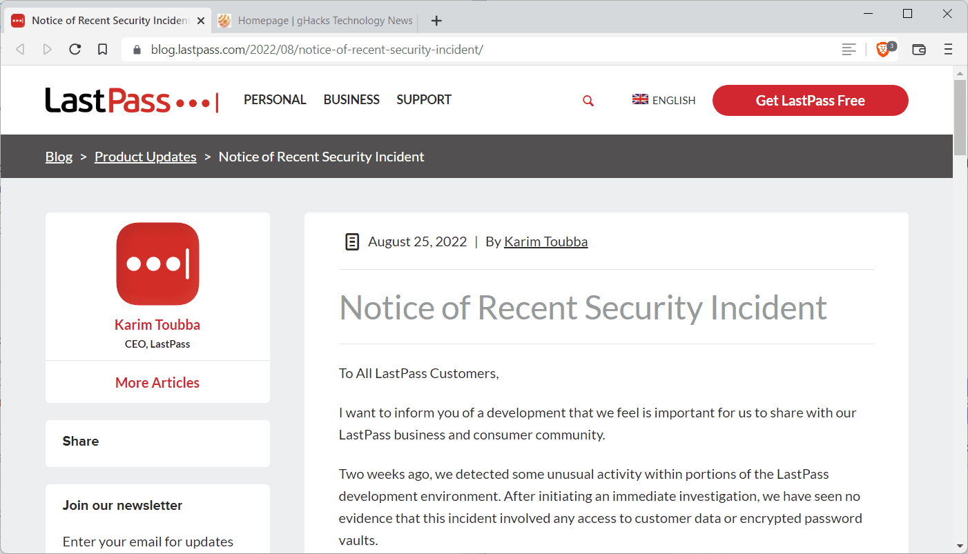LastPass, maker of the popular password management solution, disclosed a security breach that happened in August 2022 on the company site.