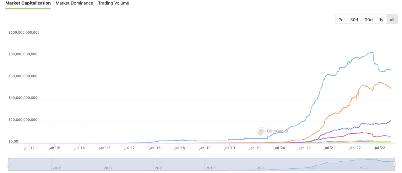 Following the significant climb since mid-2020, the stablecoin economy has seen growth slow during the last few months. In mid-April 2022, the stablecoin economy neared the $200 billion range for the first time in history, but following Terra’s stablecoin fiasco, more than $35 billion disappeared from the stablecoin economy by May 13, 2022. On May 12, 2022, the stablecoin economy was 10.66% larger than it is today at $171.37 billion.