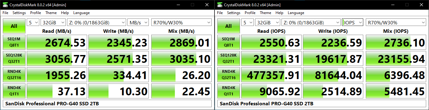 The Thunderbolt 3 PSSD with write caching on is a top performer in creative workloads, as one might expect from the SanDisk Professional brand. There are a few components where the Kingston XS2000 with its Gen 2×2 interface sneaks ahead. By and large, though, the PRO-G40 delivers results that are expected from it. The default Thunderbolt 3 PSSD setting of write caching off is a different story – in some components, it performs worse than the PRO-G40 connected via a 10 Gbps interface.