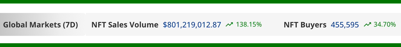 Non-fungible token (NFT) sales have soared this past week, climbing 138.15% higher than the week before. Sales recorded between last Friday and Feb. 24, 2023, indicate that $801 million in NFT sales have been settled over the last seven days.