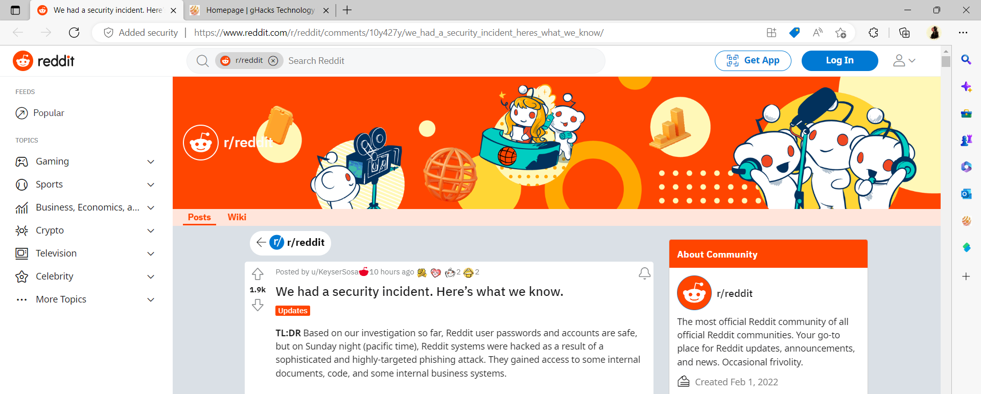 Reddit disclosed a security breach today on the site stating that a malicious actor managed to gain access to internal servers.