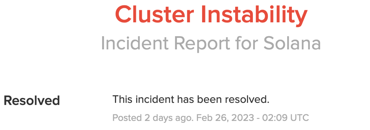 Bitcoin.com News reported on the initial downtime after the Solana Status webpage disclosed there was a problem with ‘cluster instability.’ The incident wasn’t resolved until Feb. 26, 2023, at 2:09 UTC. Some critics called the problem and previous downtime issues a “design flaw,” while others favored shorting solana (SOL). Despite the significant downtime, Solana Labs co-founder Anatoly Yakovenko defended the project, stressing that “Solana wants to be fast and super secure.” Brandon Tucker, the growth lead at Marinade Finance, a Solana-based liquid staking project, said an upcoming upgrade should significantly reduce these outages in the future.