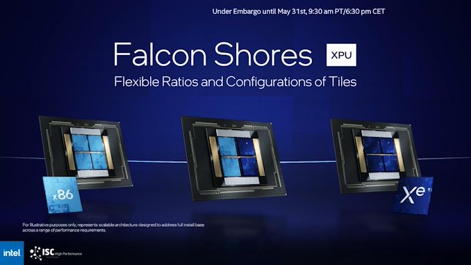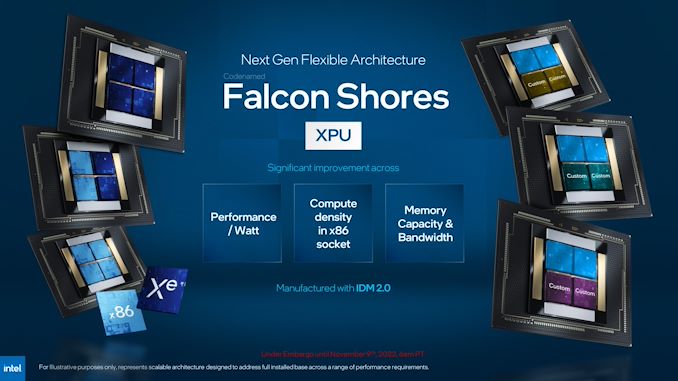 Falcon Shores was another 2022 Intel announcement, which was revealed back at the company’s 2022 Investor Meeting in February. At a high level, Falcon Shores was designed to be Intel’s first XPU product – a chip using a variety of compute architectures in order to best meet the execution needs of a single workload. This would be accomplished by using separate processor tiles, and while in practice this primarily meant putting Xe GPU tiles and x86 CPU tiles together on a single chip, the tiled approach left the door open to adding other types of accelerators as well. Intel is already doing tiled server chips with products like Ponte Vecchio and the recently launched Sapphire Rapids XCC, so Falcon Shores was slated to be the next step by placing more than just one type of accelerator on a chip.