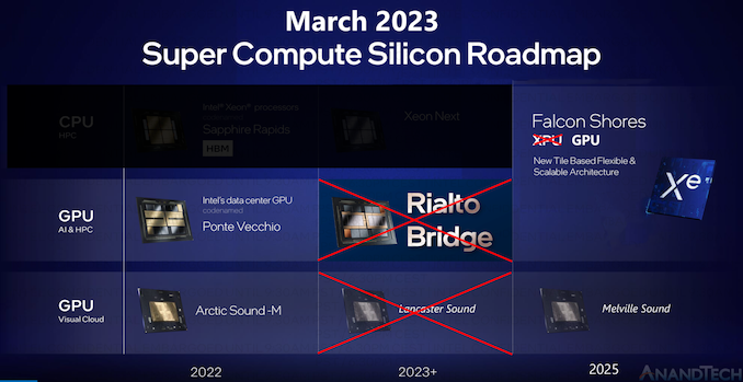 On Friday afternoon, Intel published a letter by Jeff McVeigh, the company’s interim GM of their Accelerated Computing Systems and Graphics group (AXG). In it, McVeigh offered a brief update on the state of Intel’s server GPU product lineups and customer adoption. But, more importantly, his letter offered an update to Intel’s server GPU roadmap – and it’s a bit of a bombshell. In short, Intel is canceling multiple server GPU products that were planned to be released over the next year and a half – including their HPC-class Rialto Bridge GPU – and going all-in on Falcon Shores, whose trajectory has also been altered, delaying it until 2025. There’s a lot to digest here, so let’s dive right in.